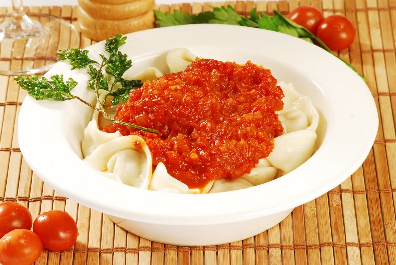 Amasar la masa y estirar. Cortar círculos de 8cm.Mezclar la carne picada con la salchicha el ajo picado y la cebolla picada y sudada en aceite. Rellenar los círculos de masa y cerrar. Cocinar en abundante agua hirviendo por 4 minutos.