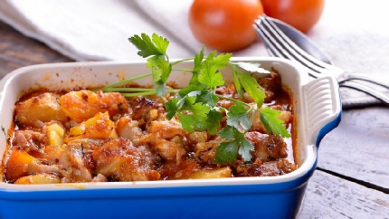 Vertemos el guiso en una fuente apta para horno y horneamos todo durante 20 minutos a 180ºC.