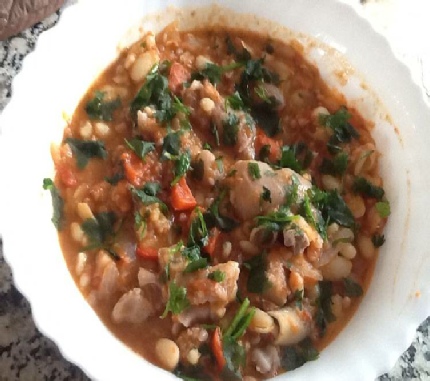 Se le añade los granos y las patas, se sazona con las hierbas, el pimentón, sal y pimienta. Si está muy seco se le puede añadir un cucharón del caldo donde se cocinaron las patas. Se tapa y se sigue guisando a fuego lento un rato más para que se impregnen bien los sabores.