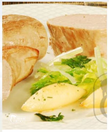 Retirar las peras y los solomillos y ligar la salsa con almidón de maíz hidratado en agua fría. Acompañar con bastones de hinojo y apio aderezados con una vinagreta elaborada con el aceite de oliva, vinagre de sidra, sal, pimienta y perejil picado.